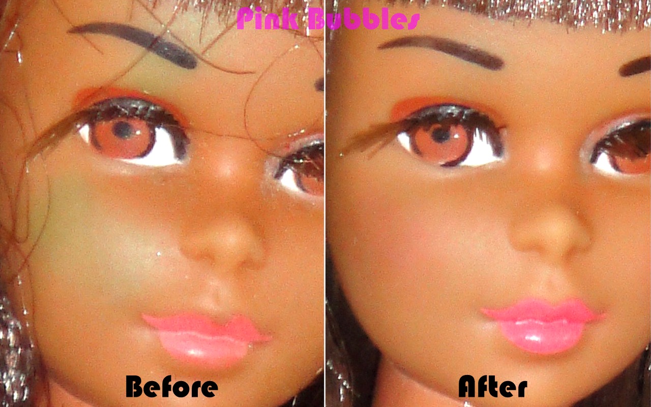 Long considered a “grail” to many collectors, this poor gal had an unfortunate bit of “Emerald City” green beginning to form on her lovely face. As reigning ‘Wizard’ here at the Pink Bubbles Doll Spa, I took on the case though I wasn’t sure if I could help her or not. I knew of course I could handle her hair and make-up requirements, after all it says so right here on the diploma’s that are framed and displayed on the walls of my station. I just wasn’t sure about her green spots. I knew “These things must be done delicately…” as quoted by a certain green-faced witch Dorothy once had a run-in with long ago!