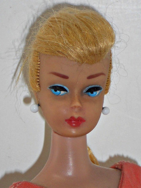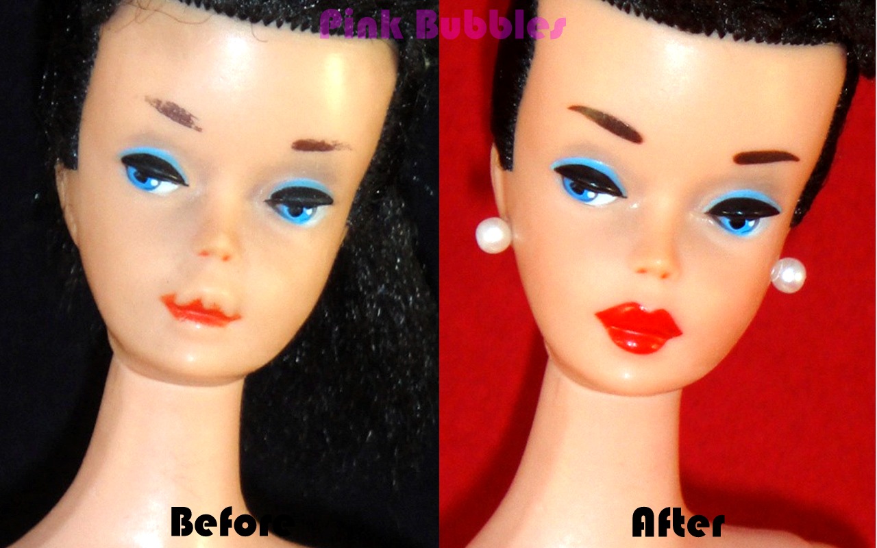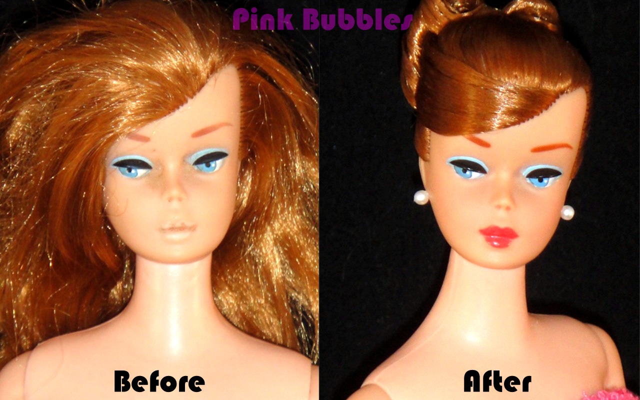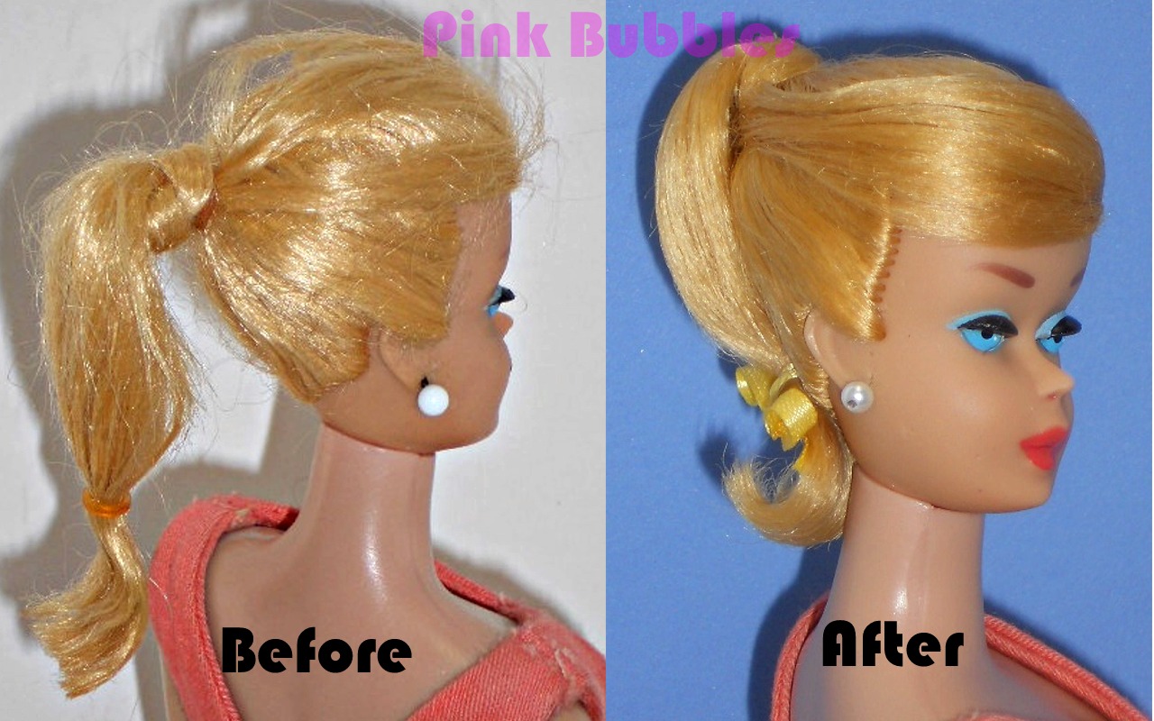 With the lightening treatment on Esther’s complexion a success, I re-styled her hair in the classic Swirl hairdo she’s worn for years…and why not, it suits her beautifully! I followed with all needed make-up repairs but chose to leave her brows alone to keep them original. A pretty yellow hair bow and a pair of “Safety-First!” pearl earrings from Beatrice’s counter were the finishing touches. Of course both ladies had their finger and toe nails done by Madge!