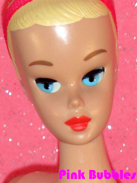 With her neck repair behind us thankfully, we discussed what was to be done as far as hair and make-up. I knew from my Mattel Beauty School Correspondence Course that the correct hair color for her was reddish-brown, but she confided to me she always dreamed of going blonde. With those baby blue’s, I agreed with her and thought it was a terrific idea. Why go with what’s expected?! Pretty new brows in a dark blonde tone and a full lips of orange-y pink brought her unique look together. And what’s Miss Barbie with out her trademark headband? I sent Daffy over to Beatrice to fetch me one from her stock in shocking pink, a tribute to the shade of Miss Barbie’s original swimsuit. All in all, a fabulous and quite striking new look to say the least and certainly unexpected for Miss Barbie fans!