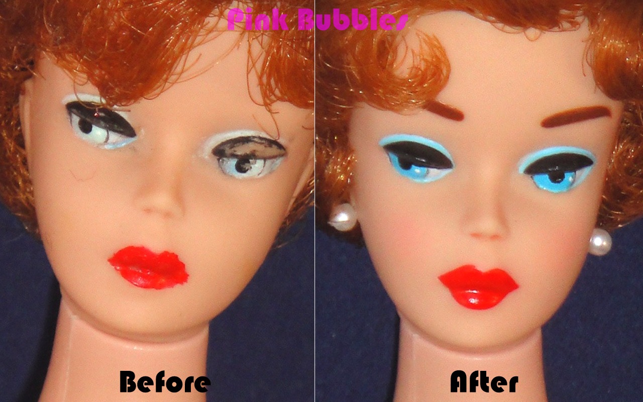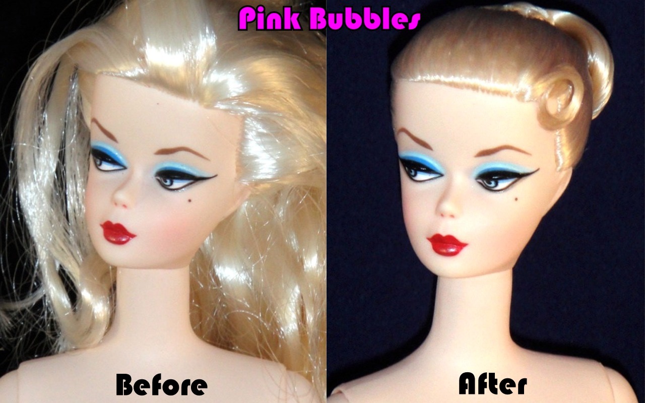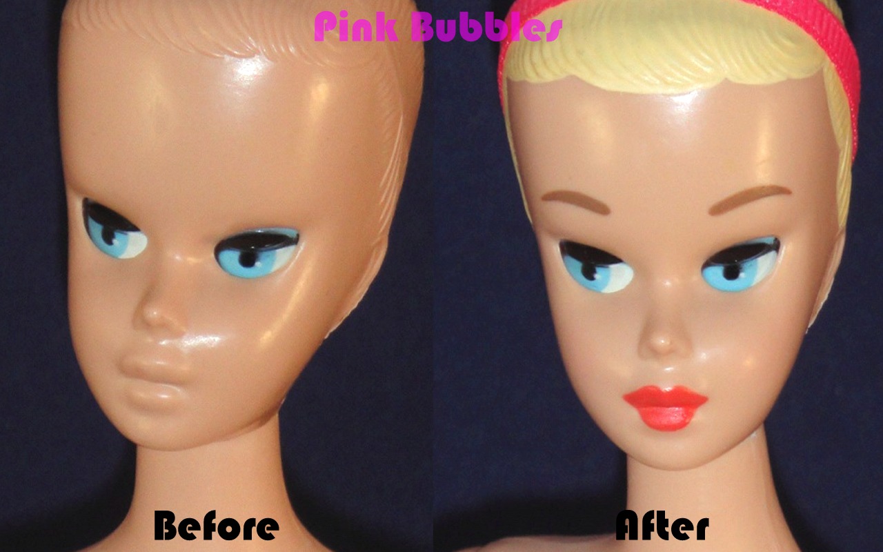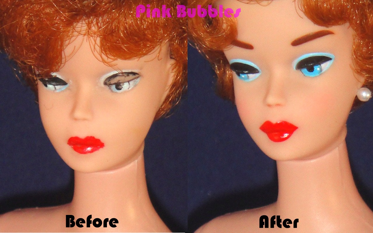 Usually I get clues as to what a new client may need as far as services when they visit me here at the Pink Bubbles Doll Spa. Traces of long-lost paint color on her face or nails can be used to color-match and repair faded or damaged make-up. Even a single hair plug salvaged from the scalp can give you an idea of her original hair color.