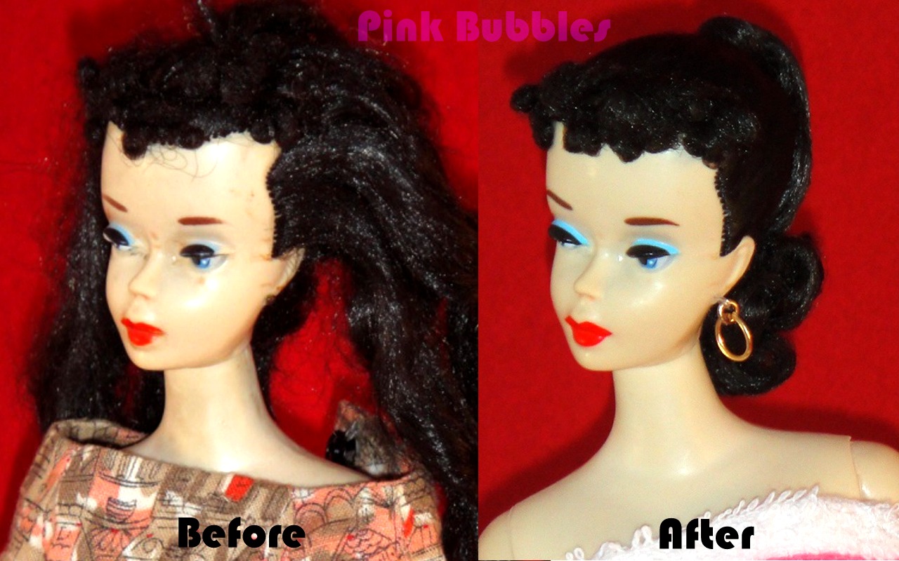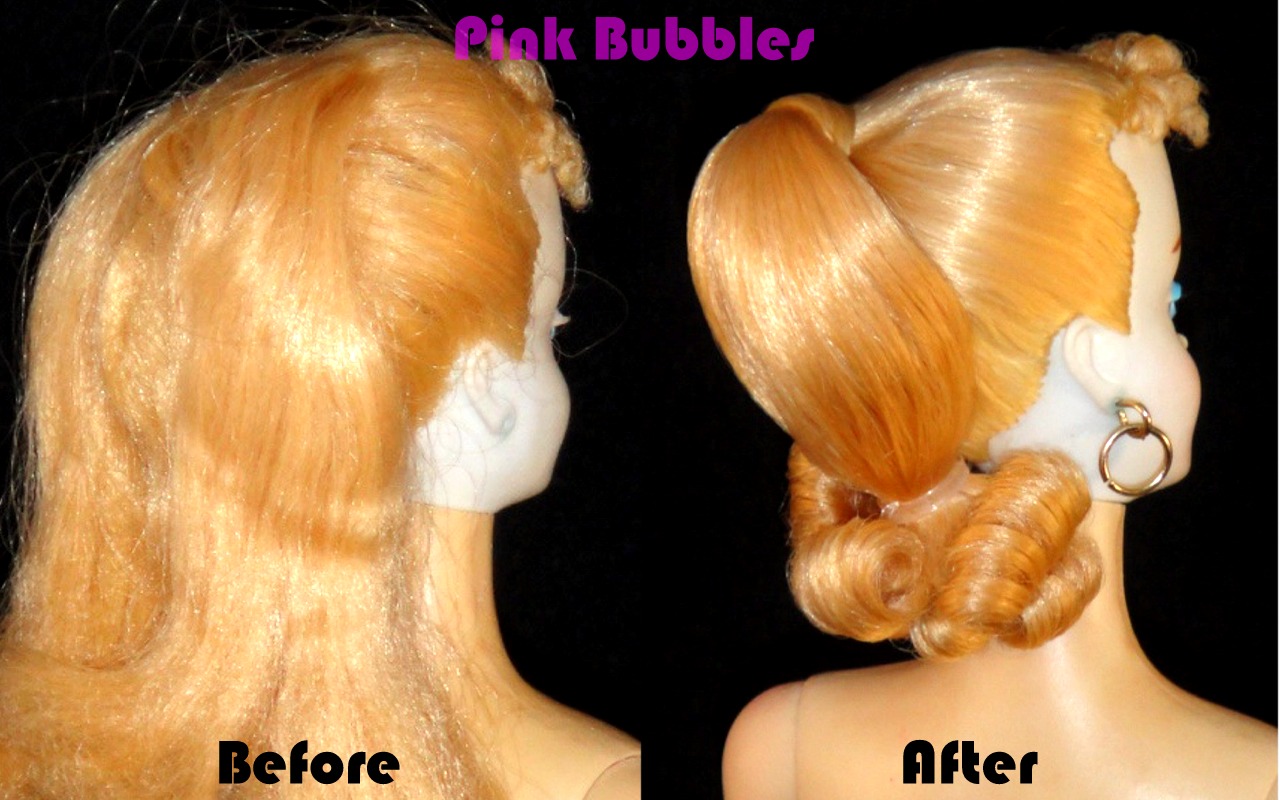 Now, we all know that a gals hair is her crowning glory, but when that crown has been irrevocably altered by a little “beautician-in-training,” it can be quite upsetting for the doll forced to live with the results. Don’t worry ladies, when a hair tragedy strikes, there’s always hope here at the Pink Bubbles Doll Spa!