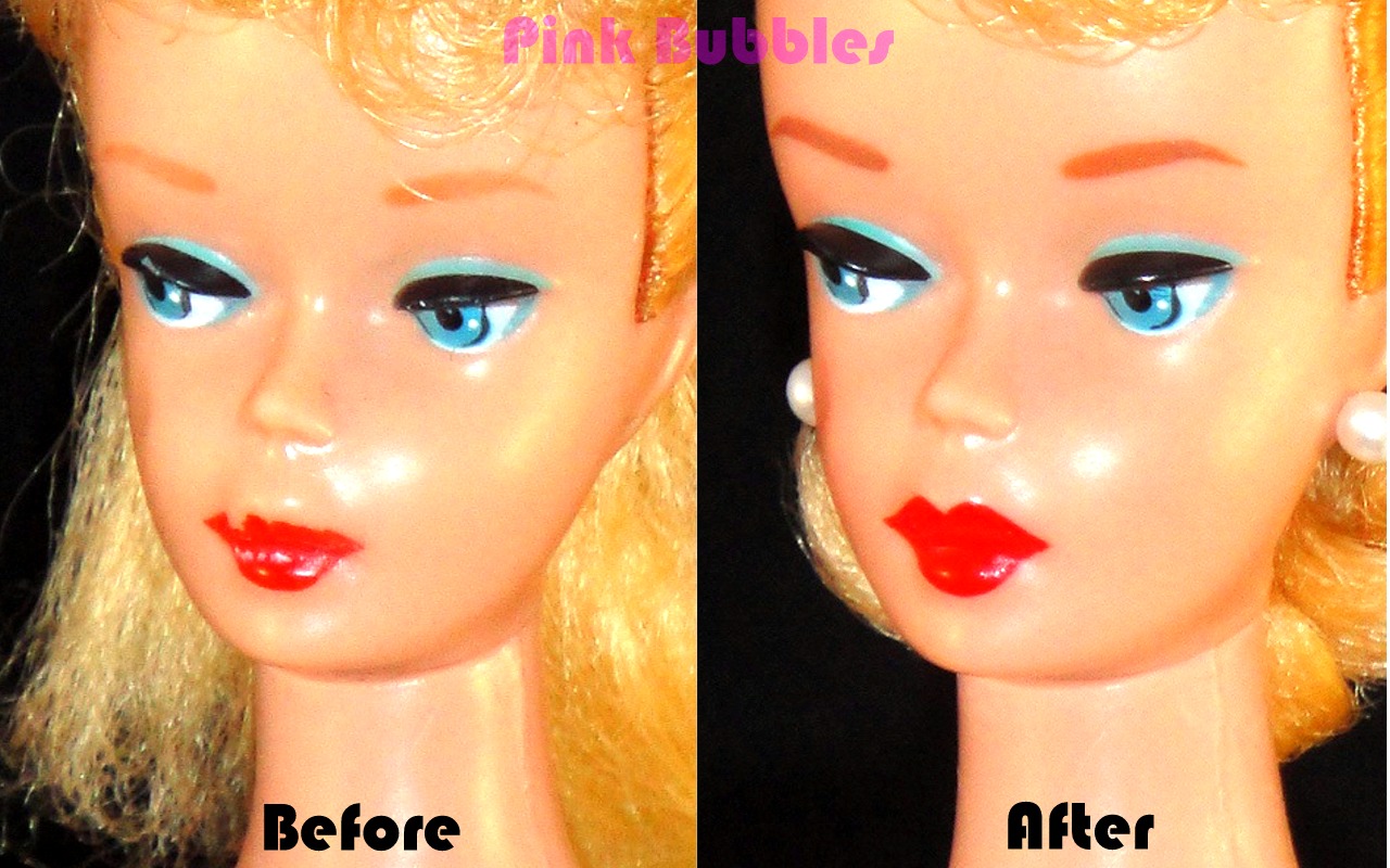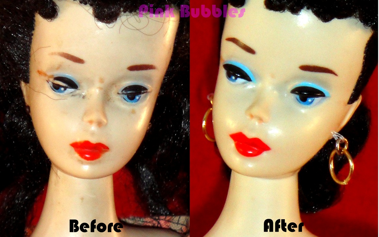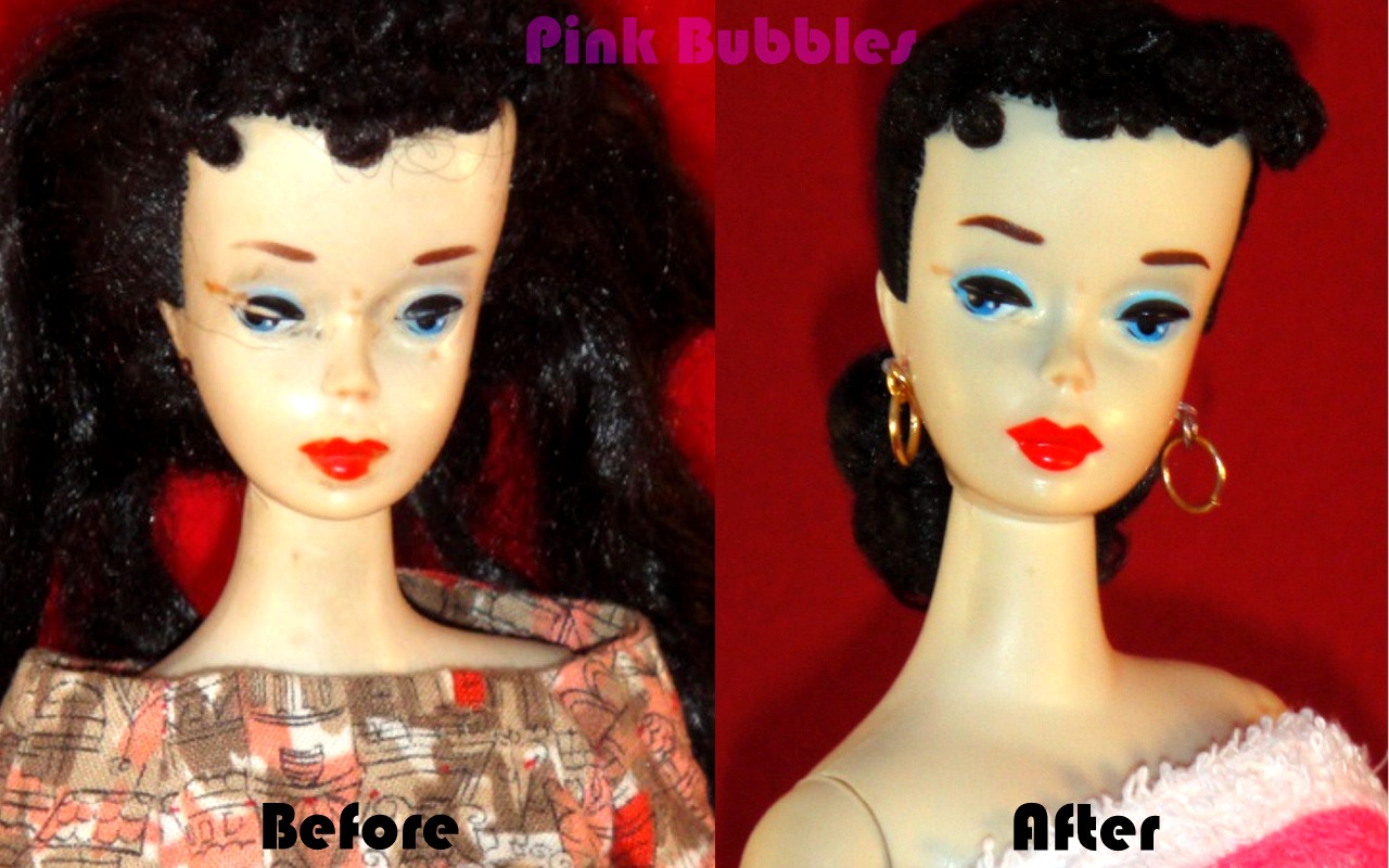 What a difference a day at Pink Bubbles can make! She’s now the perfect fashion model for “Gay Parisienne” one of the rarest of all vintage Barbie doll outfits. Magnifique!